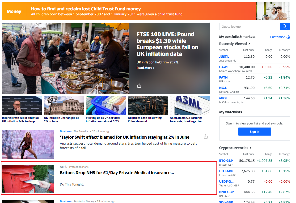 But rather than trying to describe it, the easiest way to understand Taboola is to look at what it does. This is my Yahoo Finance homepage today, and the red box (which I've added) shows an ad selected by Taboola. Roughly one in five of the items in my feed as I scroll down is an ad selected by Taboola. They are technically labelled ads, but they're also clearly designed to blend in with actual news stories.