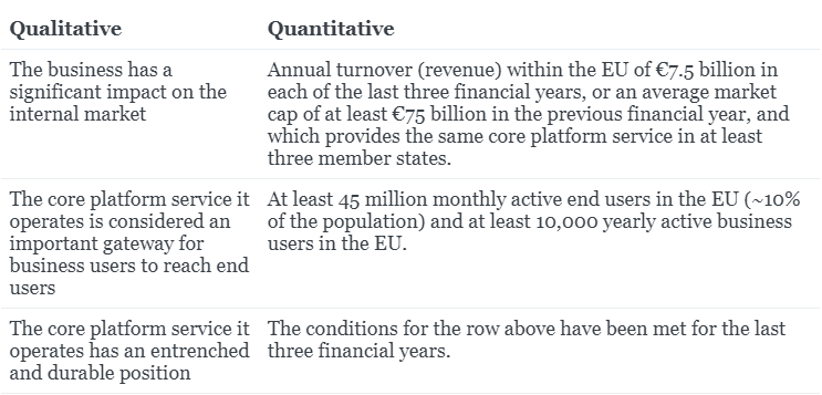- The qualitative and quantitative criteria are deliberately separate: if you meet the quantitative criteria, you're automatically a gatekeeper, but even if you don't, the Commission can argue that you meet the qualitative criteria and designate you as such.